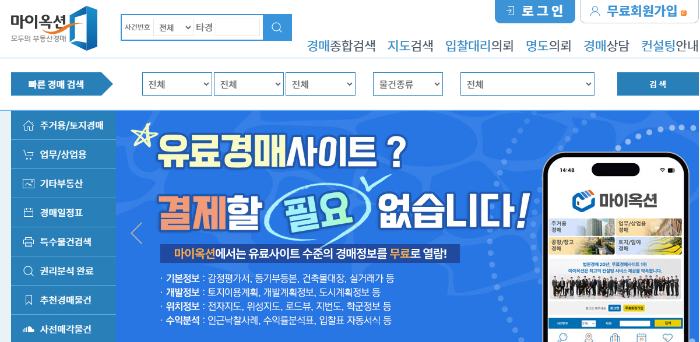 | 마이옥션 | 전국 경매 물건 데이터 제공 | 기본적인 경매 물건 검색 무료 | 실전 투자자를 위한 낙찰 통계 필요 사용자 |